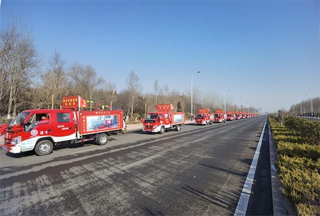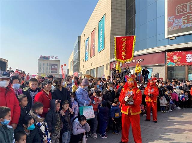 德百集团新春文化下乡大拜年活动从正月初六到正月十五,由34辆车、200余人组成的拜年队伍带着德百人的新春祝福,历经十天,行程两千余公里,走进河北吴桥、景县、东光以及德州市区、陵城区、齐河、夏津、宁津、武城、乐陵、平原、禹城、临邑、庆云等地,将清脆的快板、可爱的玩偶表演、喜庆的灯笼舞和威风的锣鼓送到消费者身边,感谢广大消费者多年来对德百的支持与厚爱。拜年队伍所到之处,一片欢声笑语,获得观众的热烈掌声,成为了新春一道亮丽的风景!